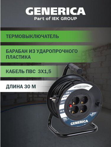 Характеристики ИЭК Удлинитель на катушке 4х30м 10А IP20 УК30 2P+PE 3х1 термозащита GENERICA WKP10-10-04-30-G